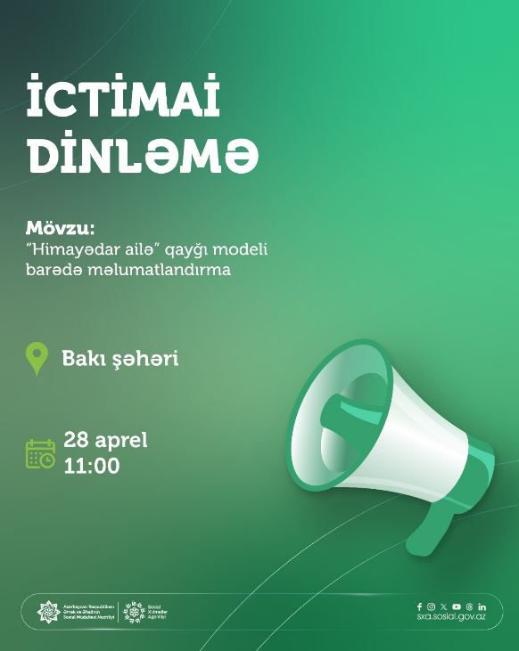 Əmək və Əhalinin Sosial Müdafiəsi Nazirliyinin tabeliyində Sosial Xidmətlər Agentliyi tərəfindən 28 aprel 2026-cı il tarixində, saat 11:00-da Bakı şəhərində ictimai dinləmə keçiriləcək.