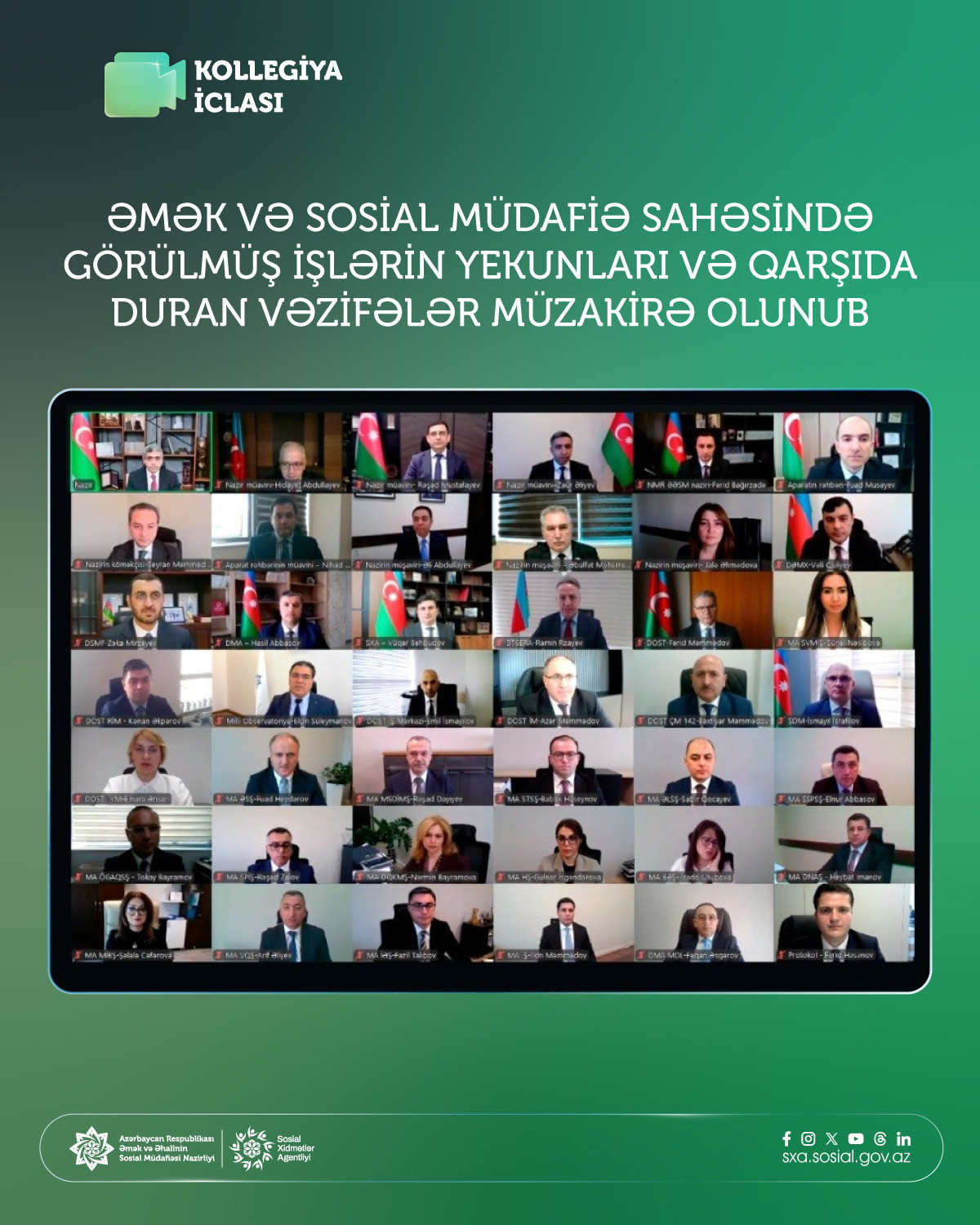 Ötən dövrdə pensiya təyinatlarının proaktiv qaydada aparılması işlərindən bəhs olunub, qarşıdakı dövrdə də Nazirlik tərəfindən sosial xidmətlərin elektronlaşırılması işlərinin davam etdiriləcəyi, proaktiv qaydada təyin edilən sosial ödəniş növlərinin əhatə dairəsinin genişləndiriləcəyi bildirilib. İclasda habelə beynəlxalq əlaqələr, daxili nəzarət və audit sahələrində görülən işlər və qarşıda duran vəzifələr müzakirə olunub.