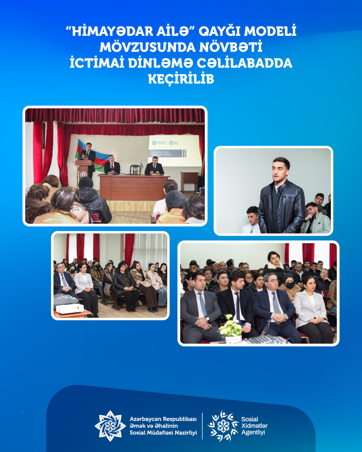 Əmək və Əhalinin Sosial Müdafiəsi Nazirliyinin tabeliyində Sosial Xidmətlər Agentliyinin təşkilatçılığı ilə Cəlilabad rayonunda “Himayədar ailə” qayğı modeli barədə məlumatlandırma mövzusuna həsr olunan ictimai dinləmə təşkil olunub.