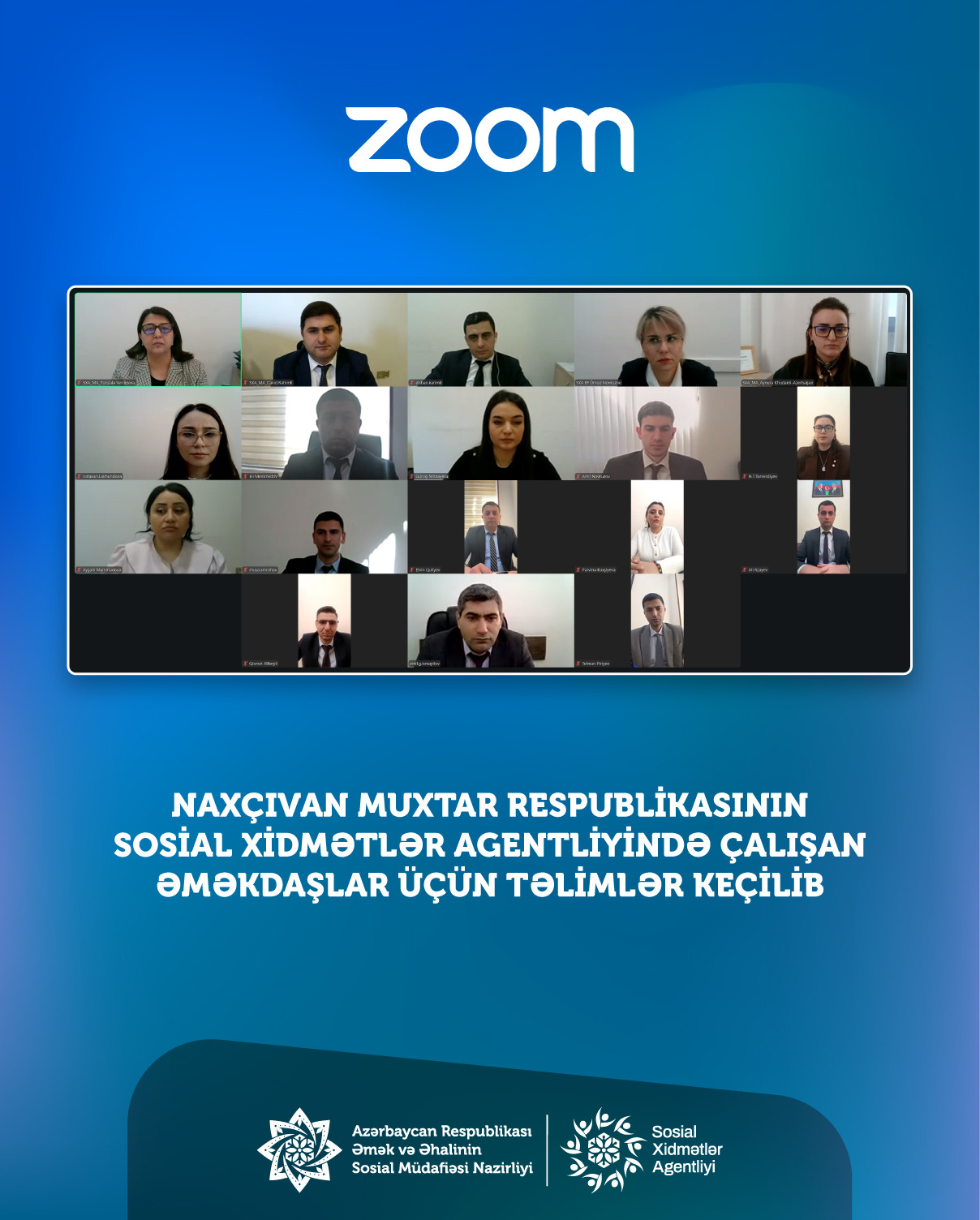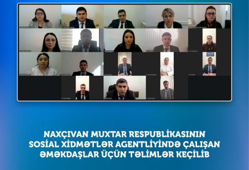 Əmək və Əhalinin Sosial Müdafiəsi Nazirliyinin tabeliyində Sosial Xidmətlər Agentliyi tərəfindən Naxçıvan Muxtar Respublikasının Əmək və Əhalinin Sosial Müdafiəsi Nazirliyinin Sosial Xidmətlər Agentliyində çalışan əməkdaşlar üçün onlayn təlimlər keçilib. Təlimlər Agentliyin müxtəlif fəaliyyət istiqamətlərini əhatə edib.