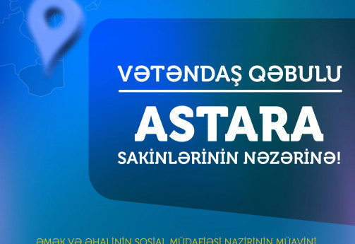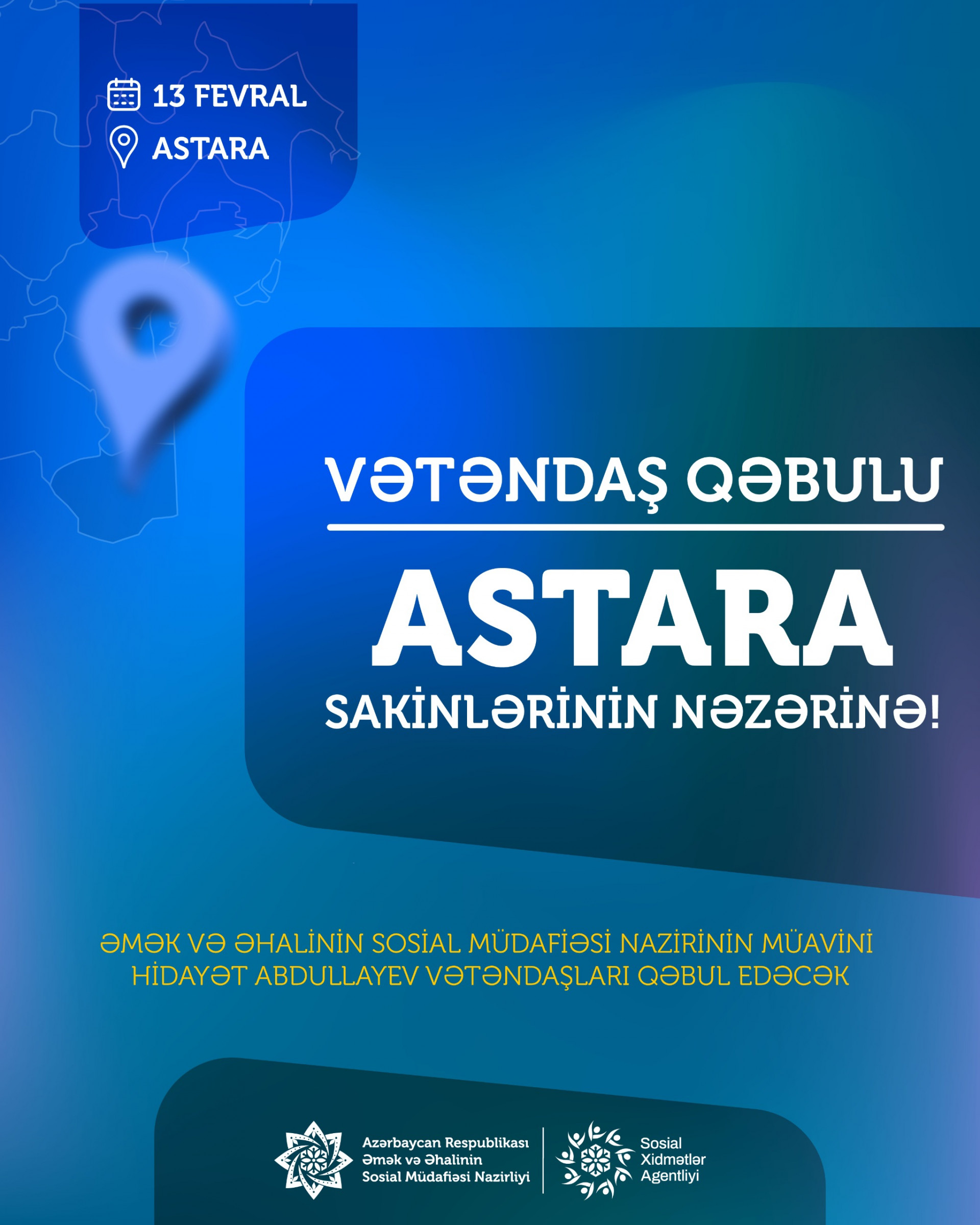 Əmək və əhalinin sosial müdafiəsi nazirinin müavini Hidayət Abdullayev fevralın 13-də Astara rayonunda sakinləri qəbul edəcək.