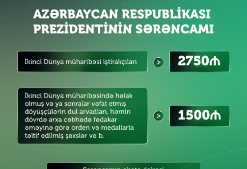 Sərəncama əsasən, İkinci Dünya müharibəsində Qələbənin 81-ci ildönümü ilə əlaqədar həmin müharibənin iştirakçılarına 2750 manat birdəfəlik maddi yardım ödəniləcək.